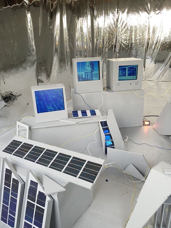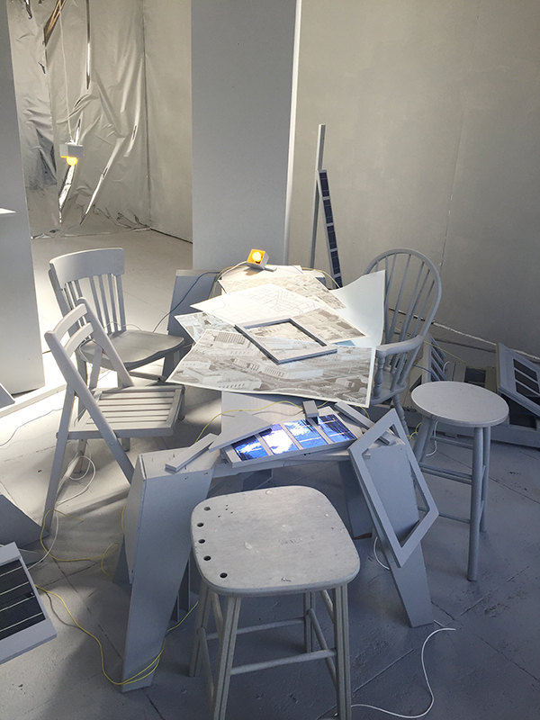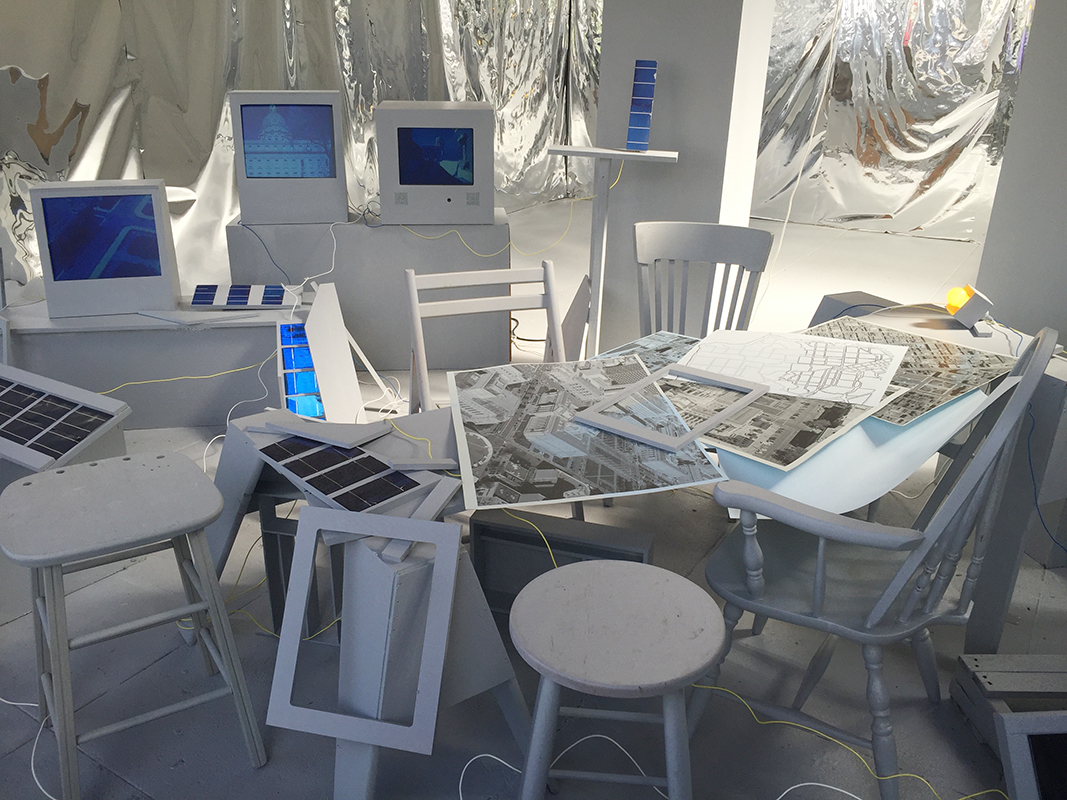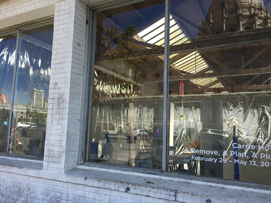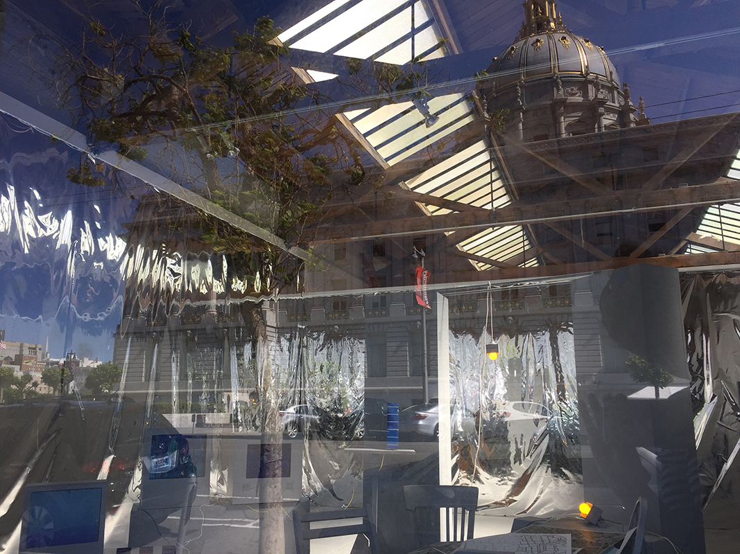 A Remove, A Plan, A Plot was a multi media installation that envisioned a space in a fictional future after the existing gallery where it was located has closed. Located next to and facing San Francisco City Hall, the installation represents a transitional planning space where there is no power supply from the city, so all electronics are solar powered.