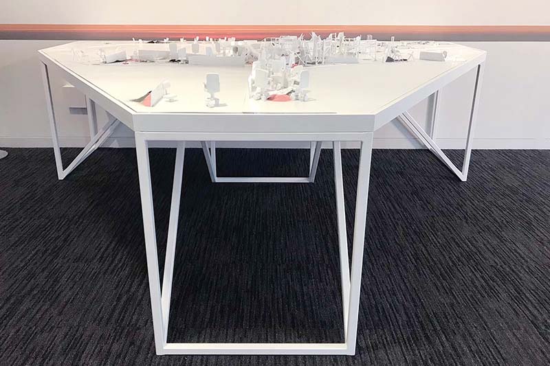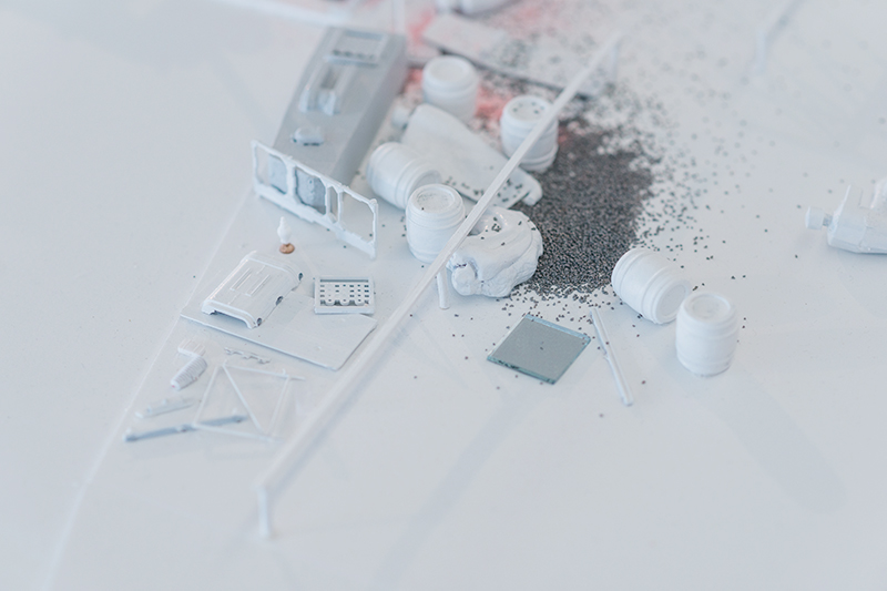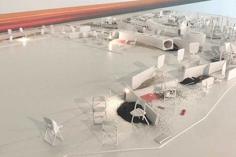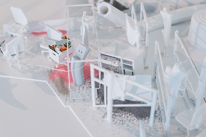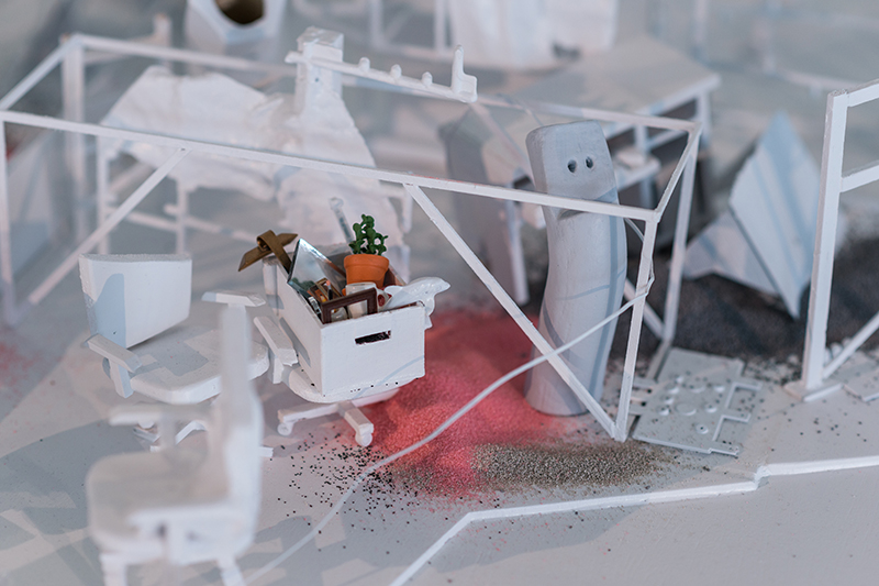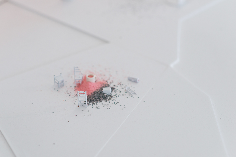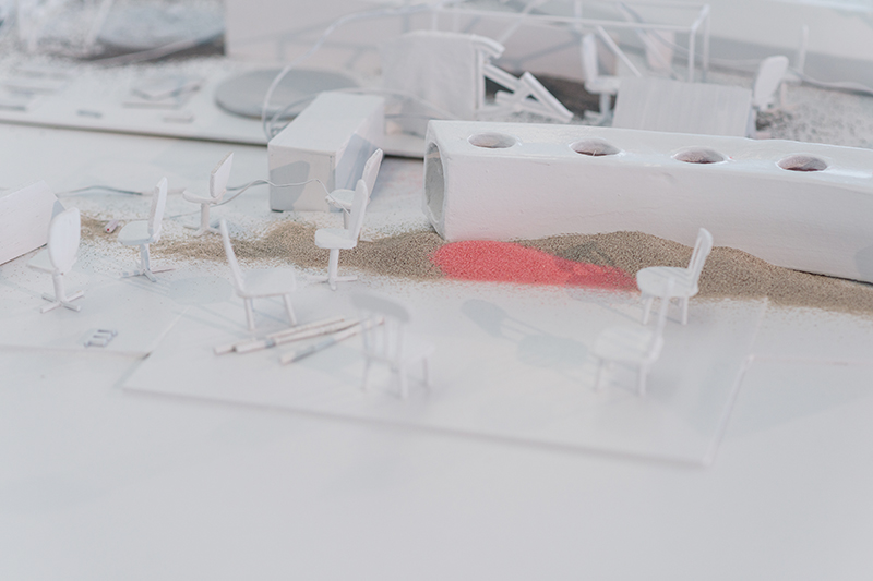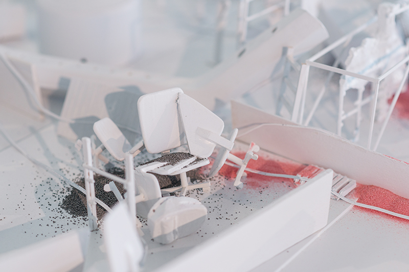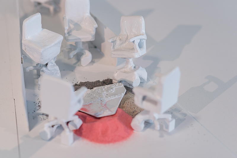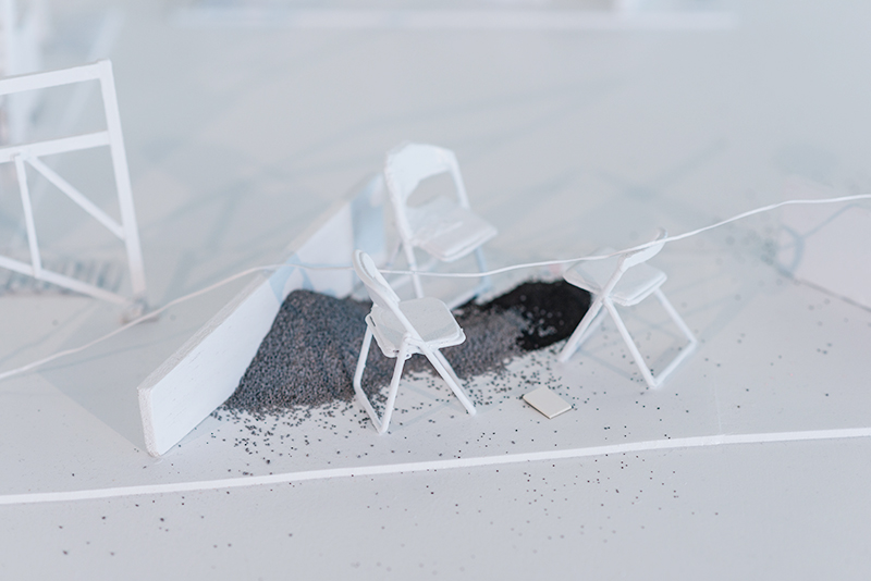 This project emerges from research on the power grid and the internet, and what forms of this system are visible. The implication of the invisible side of this system, specifically in the form of a twenty-four-seven cycle that relies on human labor, is represented through various model chair sculptures repeated in the model.