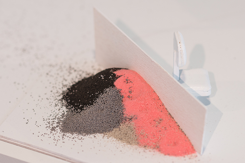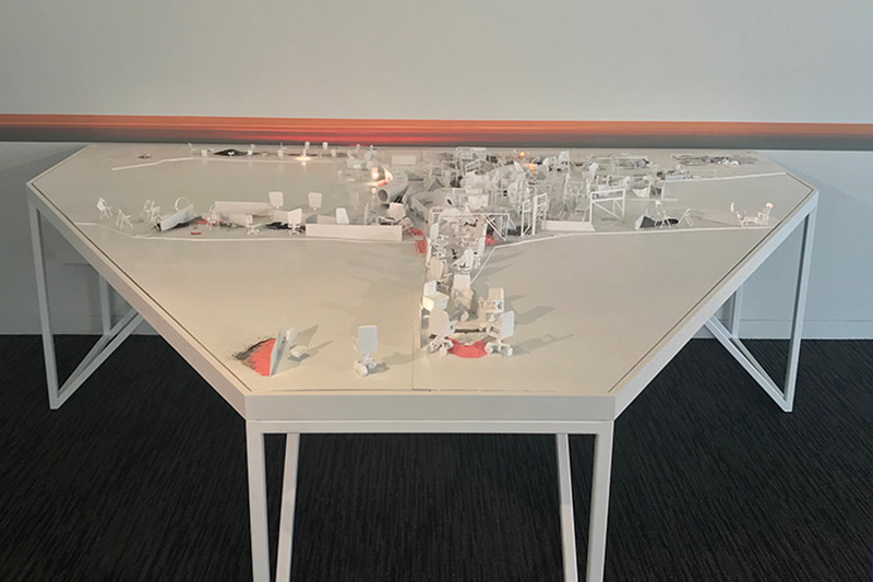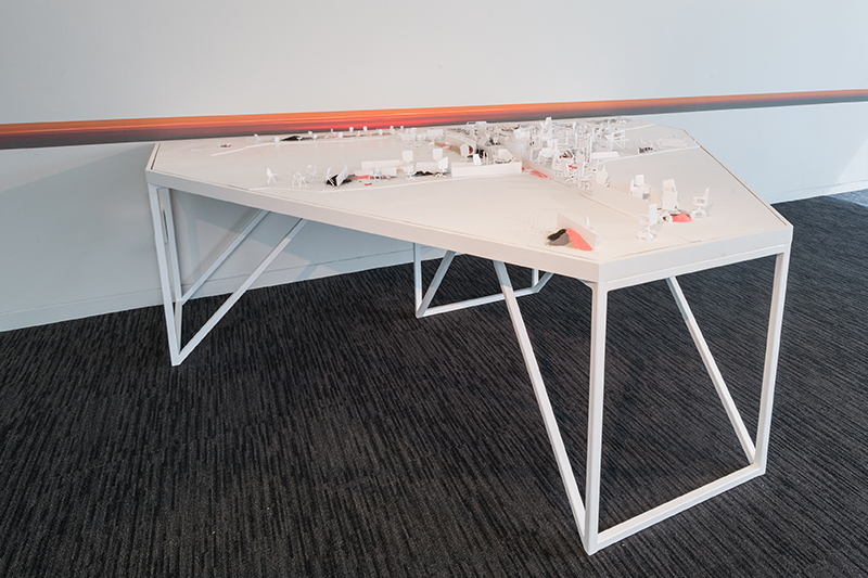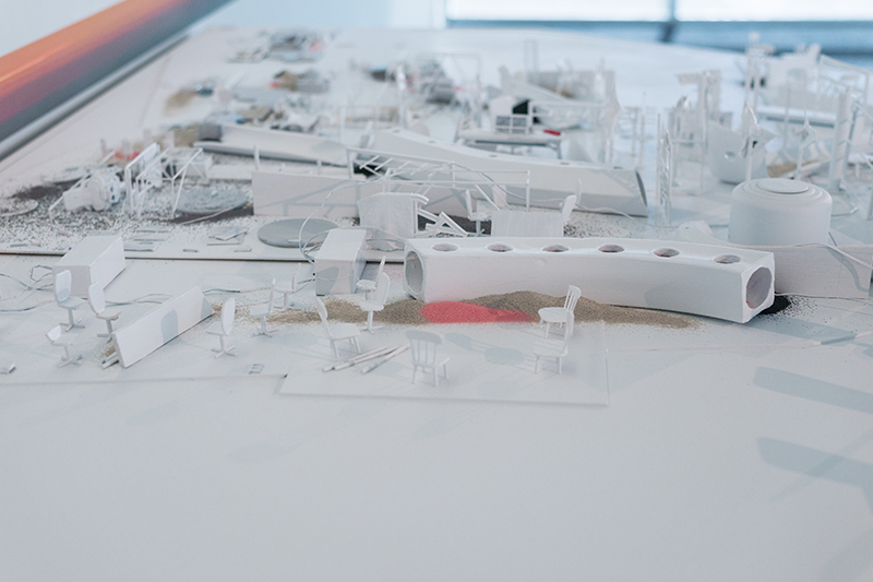 Sunset on the Polygonis a multi media installation that includes a table top architectural model sculpture that is 10 feet wide and eight feet across. The materials include wood, ceramics, plastic, glass, and sand. Behind the model is a thirty foot by six inch image of a sunset taken from the California coast during the wildfires of 2017. This installation was created for Bay Area Now 8 at Yerba Buena Center for the Arts in San Francisco, CA.