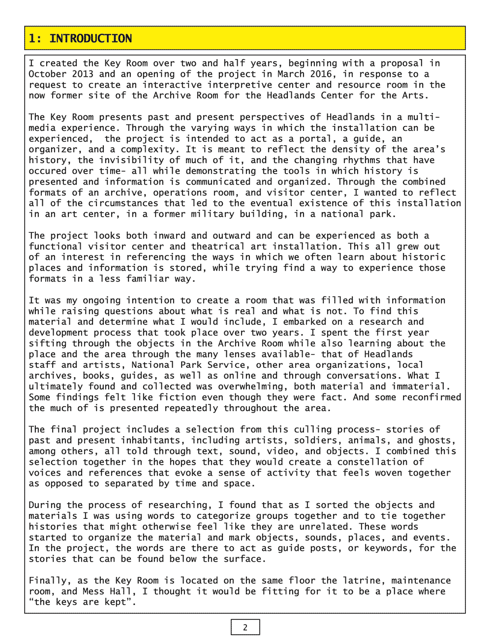 The Key Room is a permanent multi-media installation that includes sound, video, found objects, and original sculpture at the Headlands Center for the Arts. Created from a process of excavating objects, sounds, and stories from Headlands and the original Archive Room. Acting as a combined art installation, visitor center, and resource room, The Key Room is an interactive experience that ties together past and present and fact and fiction.
