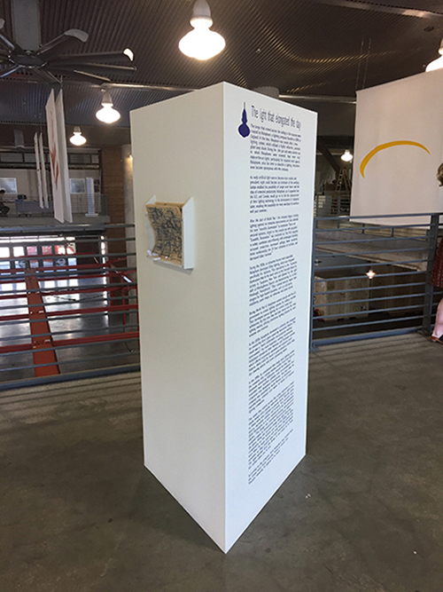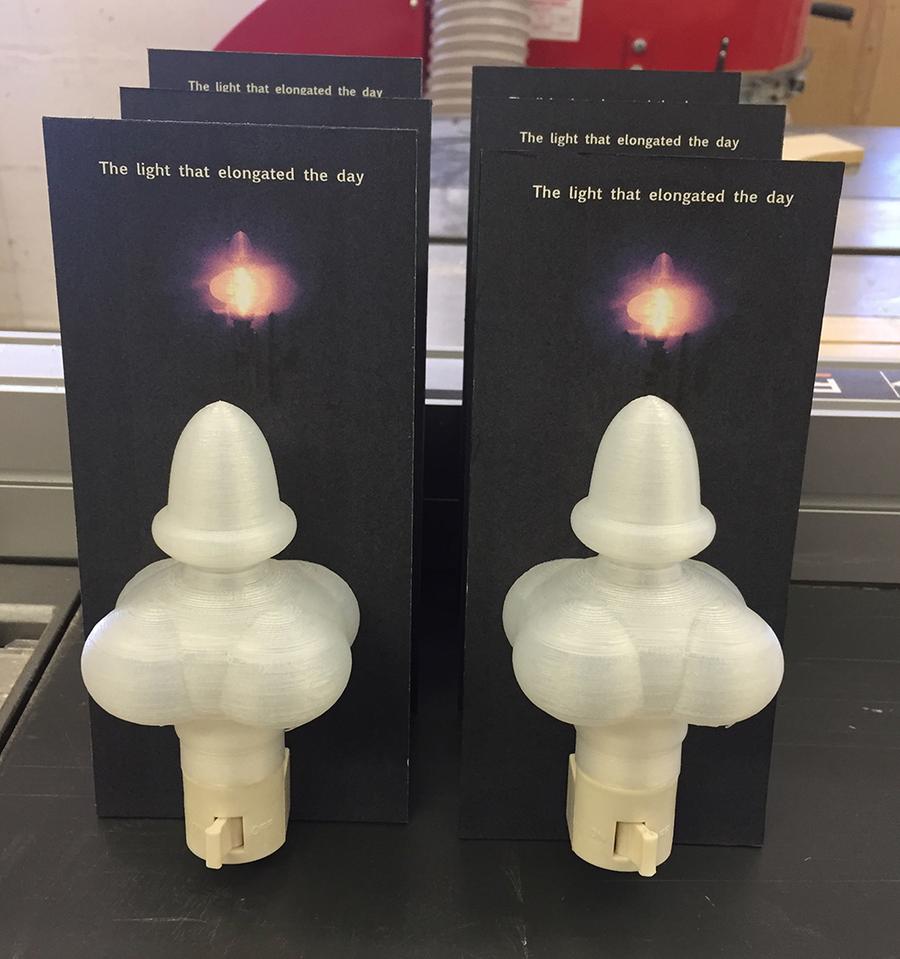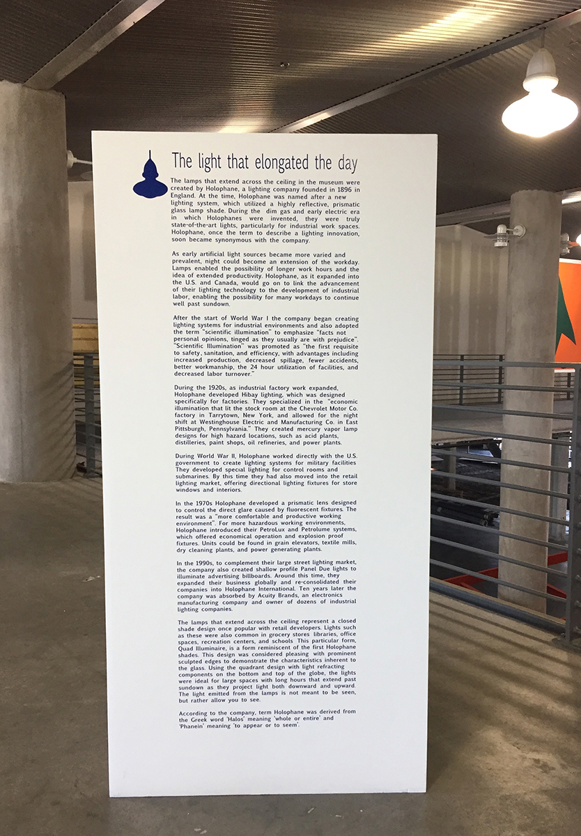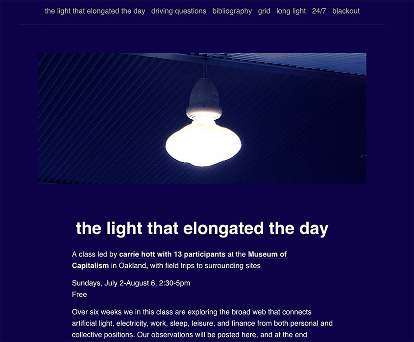 It included a site specific installation and takeaway print that referred to the existing light fixtures in the museum. The project also branched off into a free six-week class open to the public. The class explored the end of darkness, the elongation of the day, 24-7 culture, preppers, and more. These themes, when considered in the context of a museum that memorializes the era of capitalism, suggest that the ubiquitousness of light and of the grid has many parallels to the economic system of capitalism.